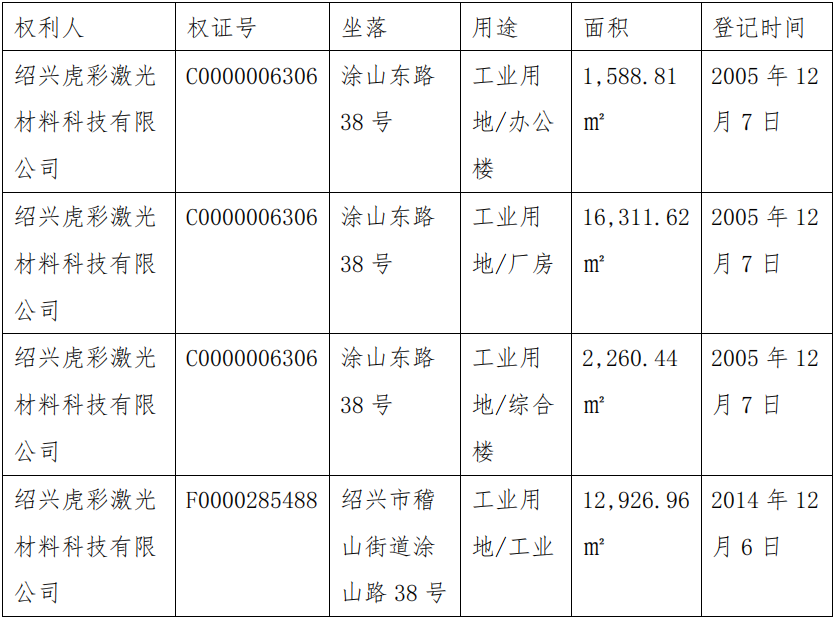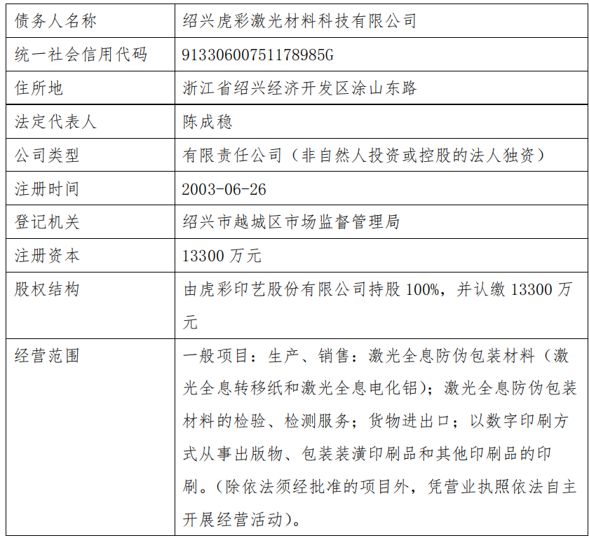 2025年9月25日,绍兴市越城区人民法院根据李浩然、刘佳倩、沈彦、陈志刚、孟未清的申请受理对绍兴虎彩激光材料科技有限公司的重整申请,并于2025年10月22日指定浙江六和律师事务所担任管理人。