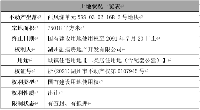 2021年4月23日,湖州市自然资源和规划局湖州南太湖新区分局与融扬公司股东杭州恺宜置业有限公司签订了一份《国有建设用地使用权出让合同》,杭州恺宜置业有限公司通过受让取得坐落于西凤漾单元XSS-03-02-16B-2号地块,宗地编号为湖新区2021-11号的土地,受让价款为76,500万元。出让宗地面积为75018平方米(约112亩),土地用途为城镇住宅用地【二类居住用地(含配套公建)】,合同项下宗地的平面界址为:位于湖州南太湖新区西凤漾单元,东侧为漾西路,南侧为沿山路,西侧为站前路,北侧为规划道路。2021年4月26日,湖州市自然资源和规划局湖州南太湖新区分局、杭州恺宜置业有限公司、融扬公司签订一份《国有建设用地使用权出让合同补充合同》,约定从《国有建设用地使用权出让合同补充合同》签订日起,《国有建设用地使用权出让合同》项下约定的土地使用权受让人变更为融扬公司,同时《国有建设用地使用权出让合同》项下的权利和义务均由融扬公司承担。据融扬公司财务资料显示,该宗土地的出让金已由融扬公司全额缴足。土地使用权具体情况如下: