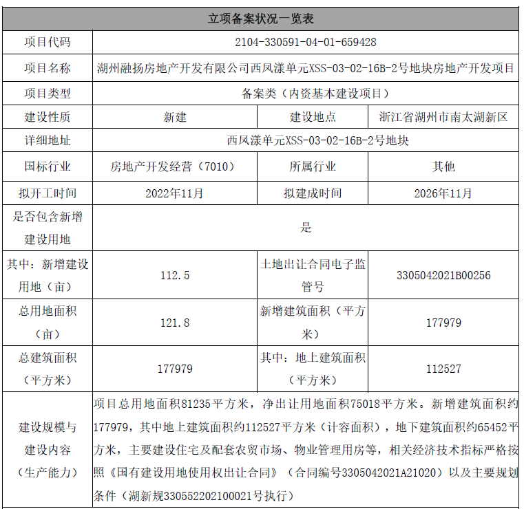 根据融扬公司于2021年4月30日向湖州南太湖新区管理委员会提交的备案资料《浙江省企业投资项目备案(赋码)信息表》,融扬公司新建开发房地产项目名称为“湖州融扬房地产开发有限公司西凤漾单元XSS-03-02-16B-2号地块房地产开发项目”,项目代码为2104-330591-04-01-659428,其立项备案情况具体如下: