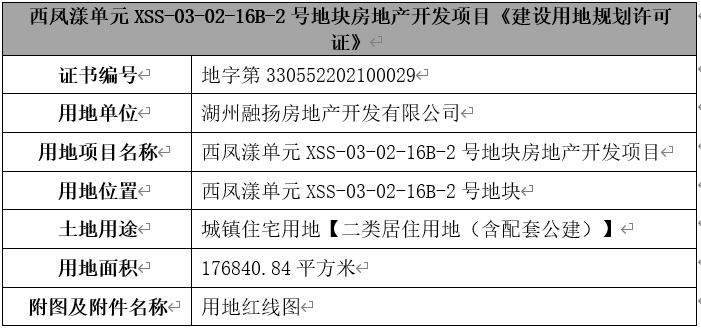 2021年6月4日,融扬公司取得西凤漾单元XSS-03-02-16B-2号地块房地产开发项目的《建设用地规划许可证》,具体信息如下: