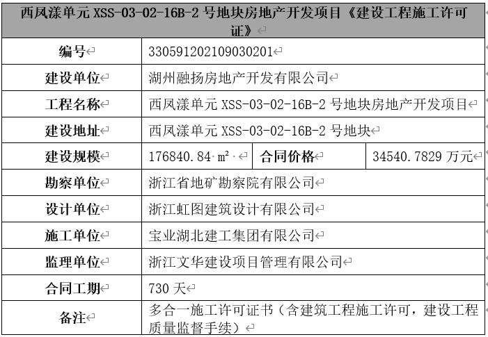 2021年9月3日,融扬公司取得西凤漾单元XSS-03-02-16B-2号地块房地产开发项目的《建设工程施工许可证》,具体信息如下: