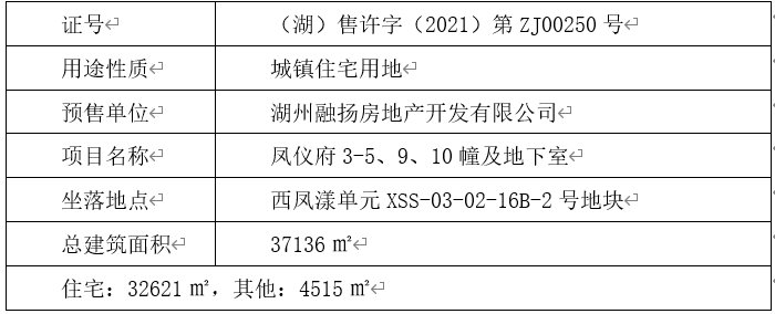 1.2021年11月11日,融扬公司取得海月凤仪府3-5、9、10幢及地下室的《商品房预售许可证》,具体信息如下: