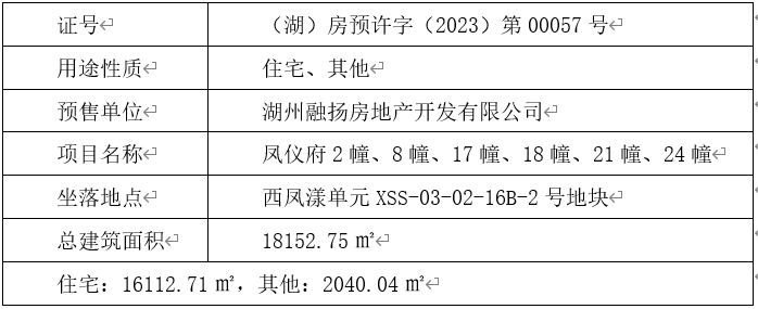 2.2023年6月15日,融扬公司取得海月凤仪府2幢、8幢、17幢、18幢、21幢、24幢的《商品房预售许可证》,具体信息如下: