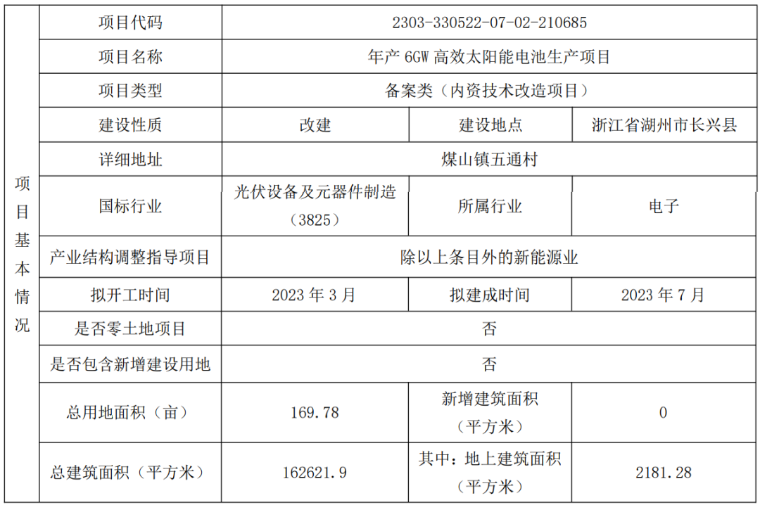 2023年3月6日,浙江国康关于6GW高效太阳能电池生产项目在长兴县经济和信息化局进行备案,根据管理人调取的《浙江省企业投资项目备案(赋码)信息表》显示的备案信息具体如下: