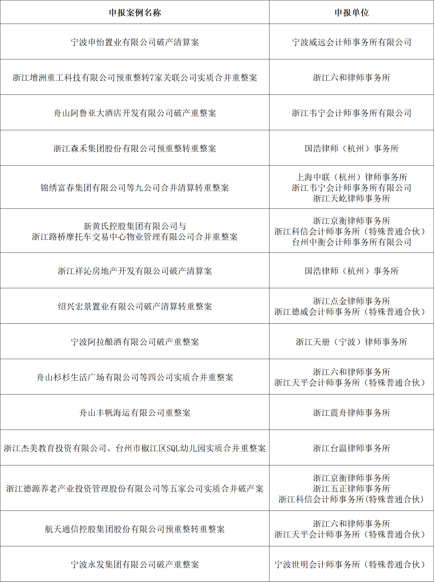 为不断总结管理人履职经验做法,发挥优秀履职案例的示范作用,促进管理人履职能力和办理破产质效提升,浙江省破产管理人协会组织开展2025年度优秀履职案评选活动。经会员单位积极申报,本次评选共征集到案例131个,其中企业破产案例79个、个人债务集中清理案例52个,现已完成专家书面评审。本着公开透明和加强管理人业务交流原则,协会拟召开现场评审会,对企业破产案例进行现场陈述,评审小组将根据初评得分情况,结合现场陈述得分情况,最终评定获奖名单;个人债务集中清理案例将根据专家书面评审分数确定获奖名单。 一、评审时间 2026年4月19日周日下午13:30—18:00 二、评审地点 杭州之江饭店三楼省新闻发布厅(地址:浙江省杭州市拱墅区莫干山路200号) 三、参评单位 初审得分排名前十五的企业破产履职案例申报单位参加现场陈述,详见入围名单。 四、评审方式 1. 每个案例可推选两名代表出席现场评审会,其中陈述人一人,另一人可辅助回答评委提问。 2.参加现场陈述的入围单位,需提前制作ppt,陈述人结合ppt进行演示、陈述,每个案例陈述时长不超过10分钟。 3.专家初审和现场陈述各100分,按照5 : 5的比例计入总分,评审小组评议后,当场公布获奖案例名单。 五、评审流程 1.主持人介绍评审流程和规则,宣读入围名单; 2.参评单位按照抽签顺序进行现场陈述,评委可现场提问; 3.全部案例陈述完毕后,评委闭门打分; 4.现场公布评审结果并颁奖。 六、注意事项 请入围的参评单位于4月10日13:00前将参会回执发送至协会秘书处电子邮箱zjbaa2018@vip.163.com(邮件名请标注XX案现场评审会参会回执);并于4月16日16:00前将ppt提交至协会秘书处电子邮箱(同上),ppt提交时请注明参评案例。参评单位若未能按时提交参会回执和ppt,视同放弃参加本次案例评选。 本次现场评审会将作为协会在线培训课程,面向会员单位在线直播,各会员单位成员可在2026年4月19日下午13:30登录协会微信小程序“学习”版块观看,敬请关注。 如有未尽事项,可联系协会秘书处,联系人:胡晓婷,联系电话:18143453273。 浙江省破产管理人协会 2026年4月7日 附:入围名单和参会回执 入围名单(排名不分先后)
