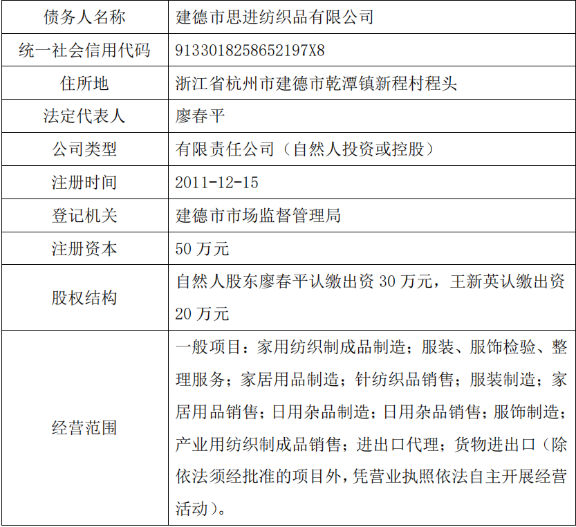 户名:建德市思进纺织品有限公司管理人